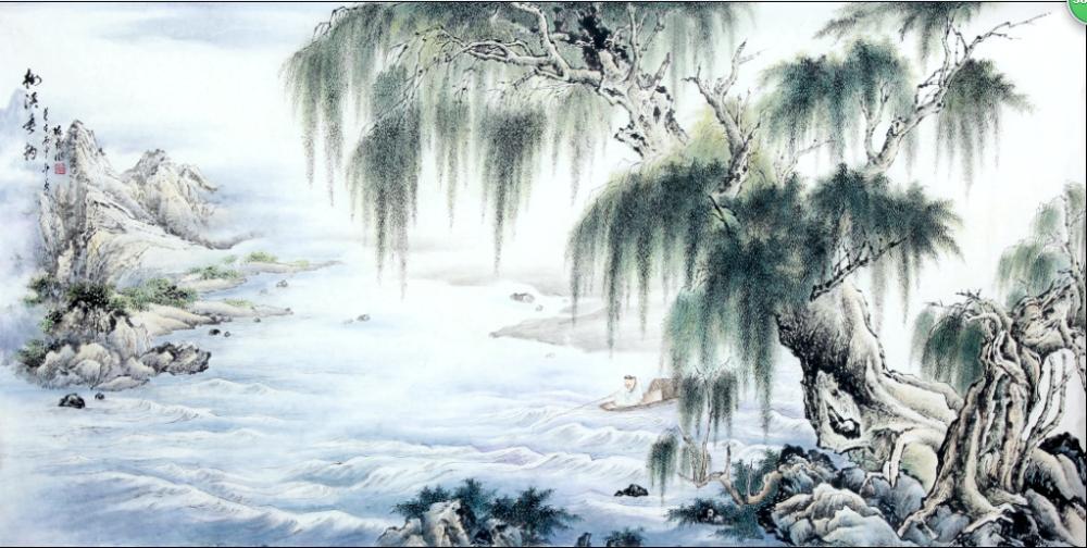 柳溪垂钓,巨柳成荫,姿势优美,平溪远岫,开阔深远,一河两岸疏密远近相间 ,水波回环静中有动,小周闲泊,一渔翁坐船垂钓,境界迷蒙幽深